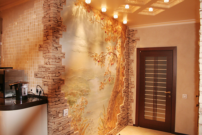 Si la première couche de finition des murs doit être nécessairement claire, la seconde peut être choisie plus foncée, car cela aidera à donner un volume à la texture peinte. Après avoir appliqué le relief, vous devez penser à la sécurité et à la durabilité de l’image. Pour cela, un mastic supplémentaire est utilisé, la composition en est enduite et ils attendent le séchage complet. En raison de la texture riche et de la variété de couleurs du matériau, vous pouvez créer des motifs inhabituels et originaux de vos propres mains.