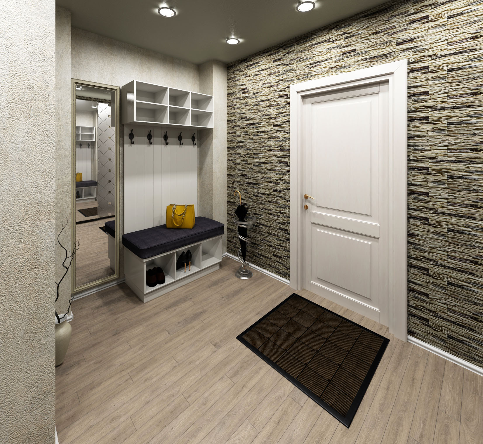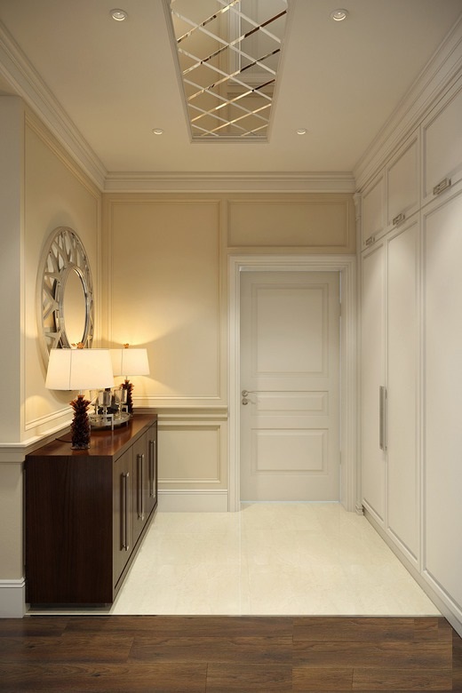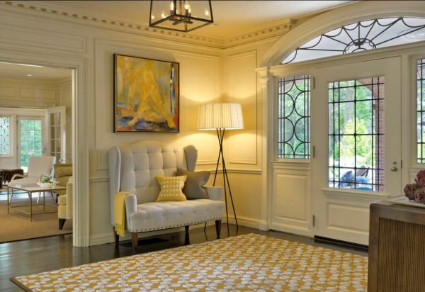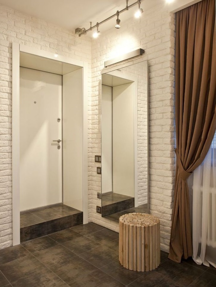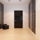 Vous pouvez simplement arrêter le choix sur une teinte plus sombre de la porte et du papier peint clair ou du plâtre texturé blanc, au centre pour placer des lampes à la lumière du jour blanche et obtenir ainsi un intérieur élégant et lumineux.