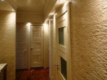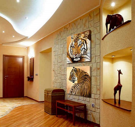 À l'aide d'un minimum d'outils, de matériaux de décoration et de vos propres mains, vous pouvez créer de vos propres mains une décoration unique des murs du couloir. Le matériau le plus mobile est le plâtre texturé. Avec son aide, vous pouvez non seulement créer diverses variations de texture sur les murs, mais également créer un dessin ou vous assurer qu'une vraie fresque est apposée sur le mur. Si vous le souhaitez, le plâtre texturé fini peut être peint dans n'importe quelle couleur, créant ainsi un espace intérieur unique. Lorsque vous utilisez du plâtre avec l'ajout d'autres matériaux, tels que la pierre, vous pouvez créer une combinaison intéressante de finitions.