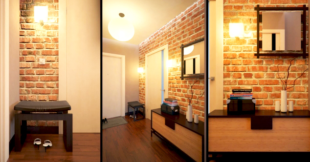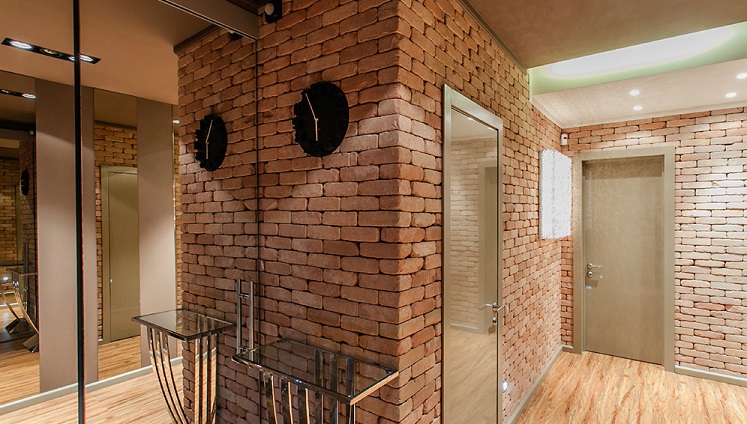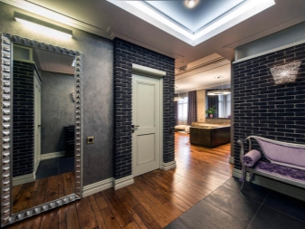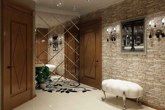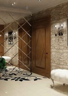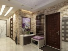 Dans la conception des couloirs des maisons privées, un phénomène fréquent est utilisation de la pierre artificielle comme matériau de revêtement mural. La production de pierre artificielle a beaucoup progressé et vous pouvez trouver une imitation de presque tous les minéraux. Le granit, le marbre, la malachite, la turquoise et la pierre sauvage sont les plus populaires parmi les acheteurs. Cette option est une roche non traitée.