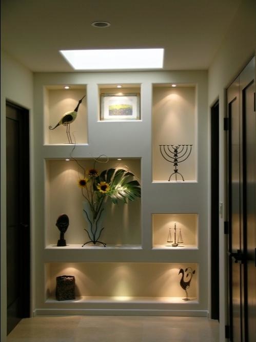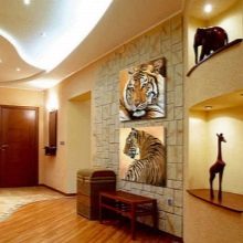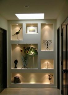 Le mur le plus vide du couloir peut accueillir non seulement des peintures, mais également une niche murale. Il peut être surmonté avec diverses solutions de couleur et de décoration et obtenir non seulement un mouvement stylistique assez intéressant, mais également un espace supplémentaire pour stocker des bagatelles intéressantes rapportées de vacances ou des cadeaux de personnes chères.