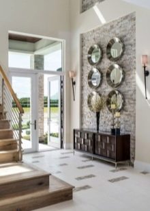 Vous pouvez également décorer le hall d'entrée avec une pierre, et il n'est pas toujours nécessaire de dépenser de l'argent pour une pierre artificielle intérieure spéciale, vous pouvez facilement l'utiliser cailloux apportés du voyage. Vous pouvez ainsi obtenir non seulement une solution intérieure intéressante, mais également un rappel constant des vacances sur vos plages chaudes préférées. Pour un tel décor, seuls des cailloux et de la colle seront nécessaires, il est également possible de construire des cailloux dans le plâtre, cela apportera également une touche spéciale à la pièce.