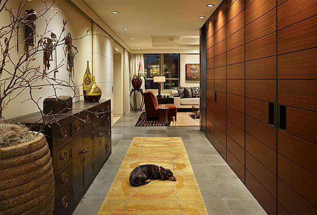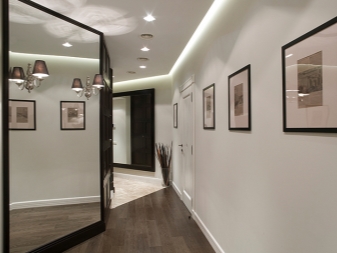 Pour aménager un couloir étroit, il convient de porter une attention particulière à la délimitation de l'espace. À l'aide de solutions de mobilier, de plafonds à plusieurs niveaux ou de couleurs, vous pouvez facilement diviser une pièce en plusieurs zones avec différentes charges fonctionnelles. Avec l'aide de la couleur, vous pouvez également ajuster la forme de la pièce. Ainsi, si vous peignez les longs murs avec des couleurs claires et les courts - avec une peinture plus sombre, le couloir trouvera visuellement une forme carrée plus complète.