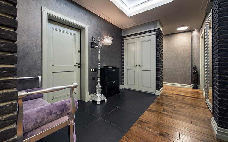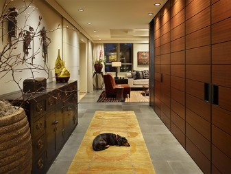 Finir le couloir dans l'appartement est évidemment une tâche plus simple que dans une maison privée. Malgré la grande maniabilité, le couloir d'un appartement typique typique d'un immeuble résidentiel n'interagit pas directement avec la rue, mais avec l'espace d'entrée, qui suppose un pourcentage plus élevé de saleté, de vent et de poussière pouvant pénétrer dans la zone du groupe d'entrée dans une maison privée. Cette fonctionnalité ouvre plus d'options pour choisir les matériaux de finition.