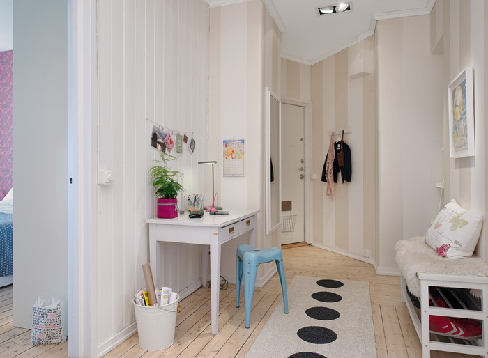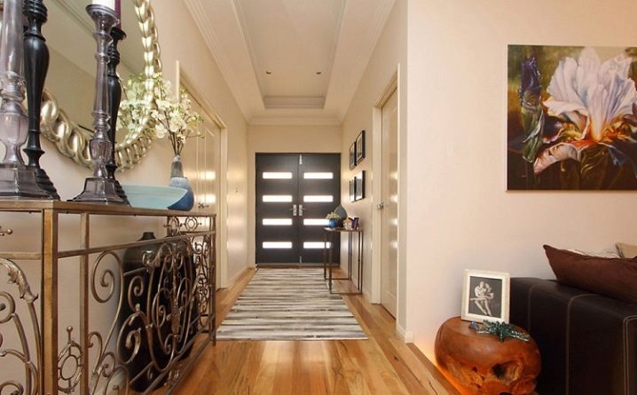 Un intérieur élégant et moderne peut être créé avec couleurs contrastées. Ainsi, des tables murales lumineuses, qui contrasteront harmonieusement avec les murs et le sol de couleurs pastel claires, auront l’air très avantageux. La seule règle de la situation avec cette option - les meubles ne doivent pas être trop volumineux, sinon l'intérieur deviendrait instantanément surchargé.Vous pouvez décorer l'intérieur fini non seulement avec des meubles, mais également avec divers accessoires. Vous pouvez par exemple accrocher un collage de photos au mur ou distribuer des images dans le couloir. Cette solution donnera un confort intérieur classique.