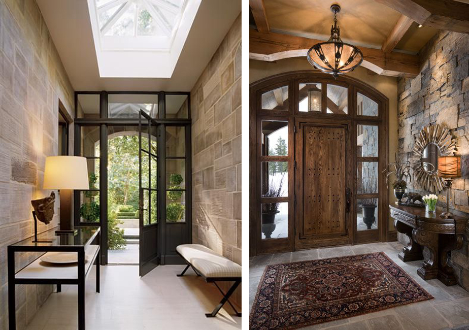 La pierre artificielle en tant que panneaux décoratifs peut être placée sur toute la surface du mur. Il est également possible de créer des éléments intéressants en forme de points, en complétant la surface avec du plâtre de différentes textures et d'obtenir ainsi un effet complètement différent. Avec une pierre vous pouvez sécurisé et le plus affecté par les éléments des murs. Par exemple, vous pouvez créer un arc de pierre à la porte, décorer le mur, près duquel se trouvent des étagères ouvertes pour les chaussures, des niches, des éléments en saillie - tout peut être équipé d’un beau décor pratique en gazon synthétique.