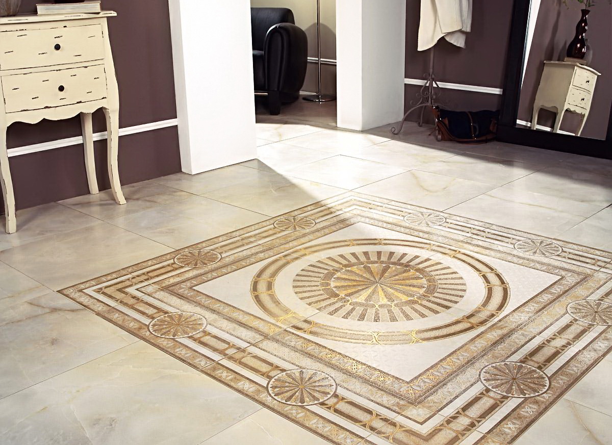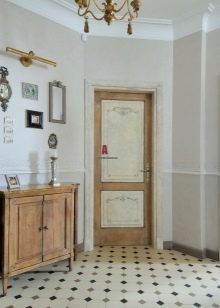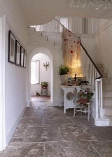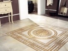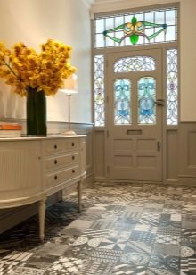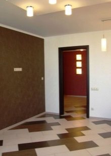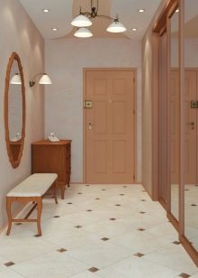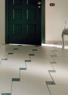 Si un intérieur moderne et lumineux dans le couloir est supposé, la combinaison de grands carreaux et de petits éléments décoratifs avec une impression brillante sur le revêtement de sol peut constituer un bon choix. Les inserts originaux brillants peuvent être répartis dans le couloir ou sélectionner une zone distincte pour leur emplacement, par exemple à la porte ou au centre.