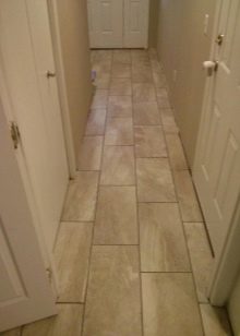 Les grandes tuiles élargiront visuellement la salle d'entrée, ce qui est particulièrement important dans les vieilles maisons de Khrouchtchev construites avec des couloirs étroits et petits. Mais il faut se rappeler que plus le produit est volumineux, plus vous devez faire attention au choix du schéma de disposition pour éviter un gaspillage accru. La surface du matériau de finition peut être brillante, texturée ou mate.