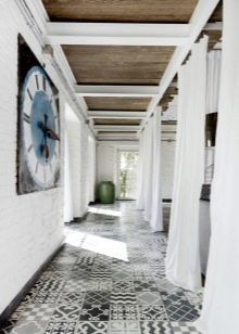 Un couloir de type ouvert, où la lumière du soleil est toujours disponible, peut être agencé à l'aide de nuances de carreaux de céramique plus vives et plus colorées. L'éclairage naturel ne déformera pas les couleurs et les plus rentables véhiculeront l'idée créative du concepteur.