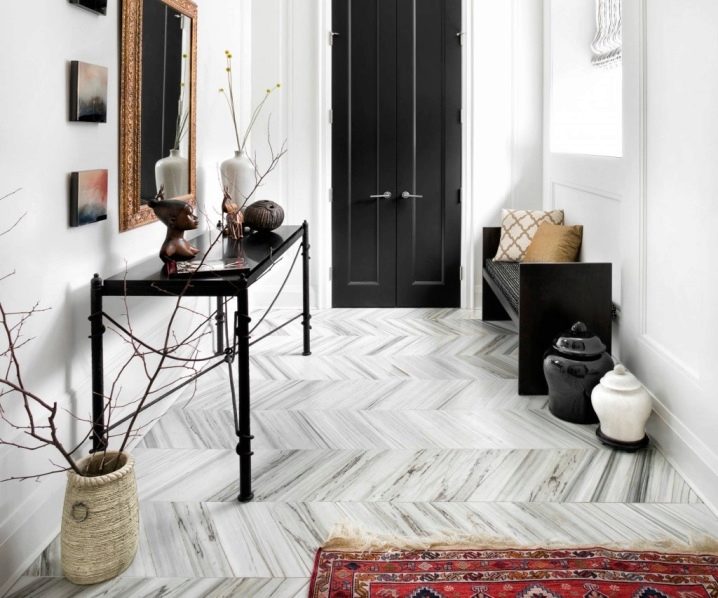 Il est judicieux de disposer un tel plancher dans un couloir spacieux et de le combiner avec un mobilier clair de formes strictes, car la teinte de la tuile absorbera activement la lumière. Les couleurs vives du revêtement de sol contribueront à agrandir visuellement l'espace et permettront aux yeux de se détendre, mais chaque point de la chaussure sera visible à l'œil nu.