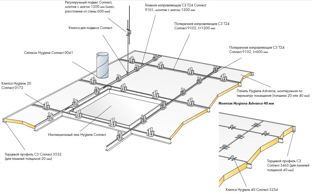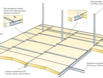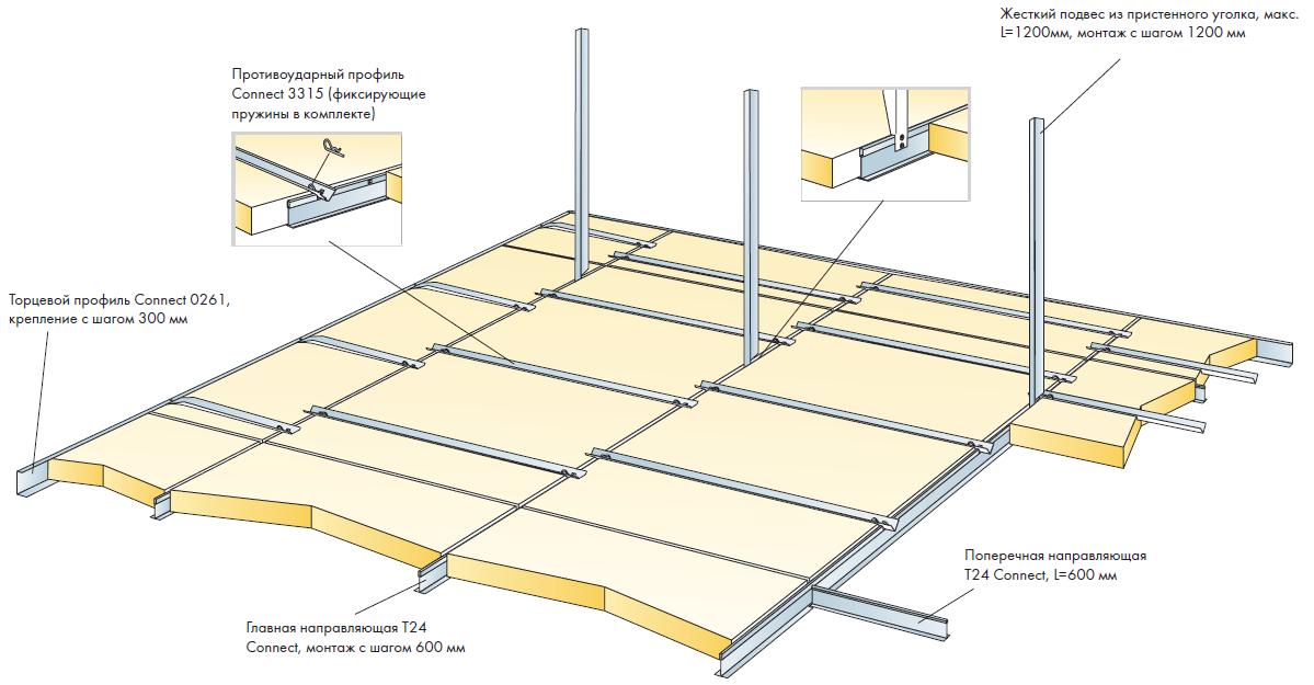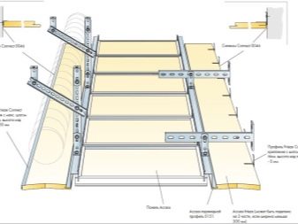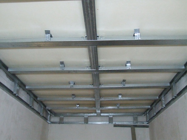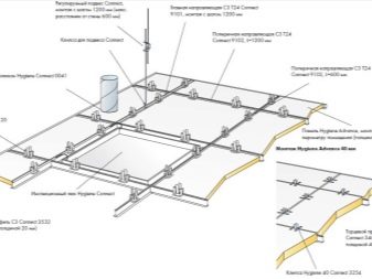 La séquence de montage de l'isolation acoustique du cadre est suivie d'exemples de la disposition de la structure suspendue. L'installation commence après la fixation des nœuds directement au plafond. Ce travail doit être effectué dans des conditions d'humidité de 70%, la température entre-temps doit être comprise entre +15 et -30 ° C.