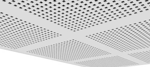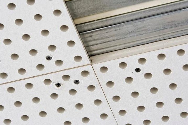 Souvent, des plaques de plâtre perforées de type 595x595 mm avec une épaisseur de 8,5 mm sont utilisées pour installer une isolation acoustique. En même temps, la partie avant peut être décorée avec divers matériaux, le dos des produits est recouvert d’une couche d’isolation acoustique en non-tissé.