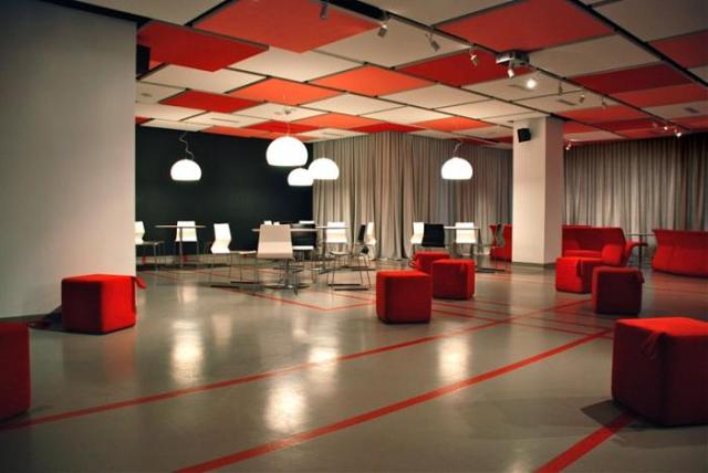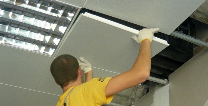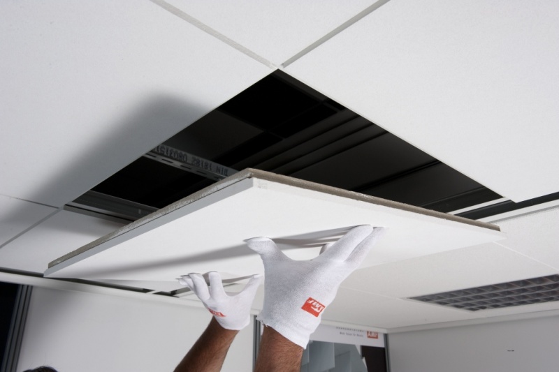 - Les plaques acoustiques sont installées directement dans les cellules situées dans le cadre assemblé. Les plaques sont inclinées au-dessus du faux plafond et libérées horizontalement sur le lieu préparé.