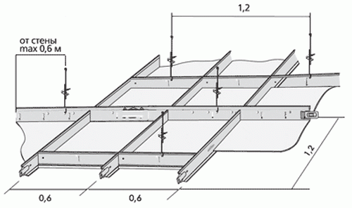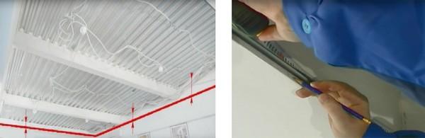Le marquage est appliqué pour accueillir les suspensions, qui seront situées au-dessus du profilé de support à une distance de 1,2 mètre et ne dépassant pas 0,6 mètre du mur. 0,6 mètre est rarement fait, il est donc recommandé d’organiser le marquage des échecs. Dans le même temps, la charge sur les supports installés ne doit pas être dépassée (3,5 à 6 kg / m²).