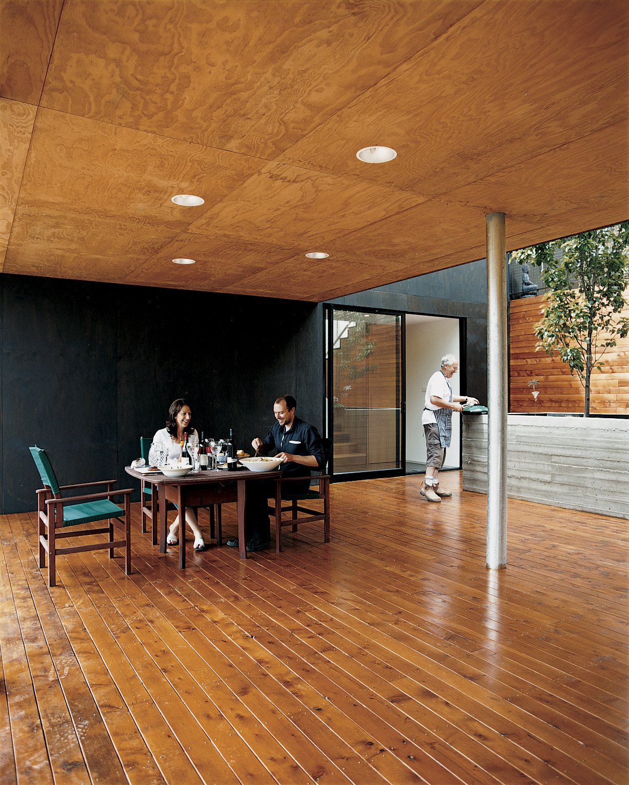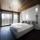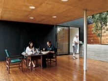 L'un des styles les plus modernes est la technologie de pointe. Il se caractérise par l'utilisation de lignes claires et de motifs géométriques. Le bois ici est tout à fait approprié, car c'est l'un de ses matériaux de base. Dans le style high-tech, vous pouvez utiliser des planches de couleurs foncées et quelque chose de plus original, par exemple des poutres décoratives.