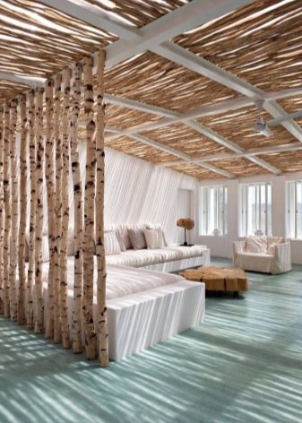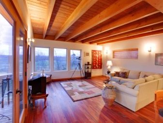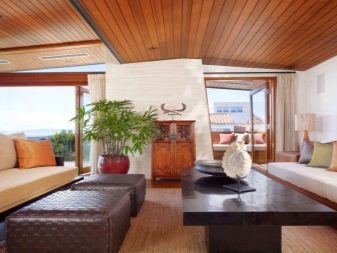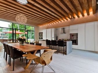 Lors de l'enregistrement du plafond, on utilise le bois naturel non peint, non recouvert d'énormes couches de vernis et en conservant l'état d'origine. L'aspect du plafond en style écologique doit être aussi naturel que possible.