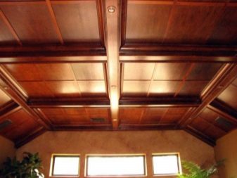 Une autre option intéressante consiste à finir le plafond avec des panneaux en bois massif. Ils sont généralement fabriqués à partir d'essences de bois précieuses. Cependant, dans la plupart des cas, seule la partie avant du panneau est constituée d'un matériau aussi coûteux. Outre elle, il y a deux autres couches. Pour leur production sont des races moins chères, par exemple, le pin.