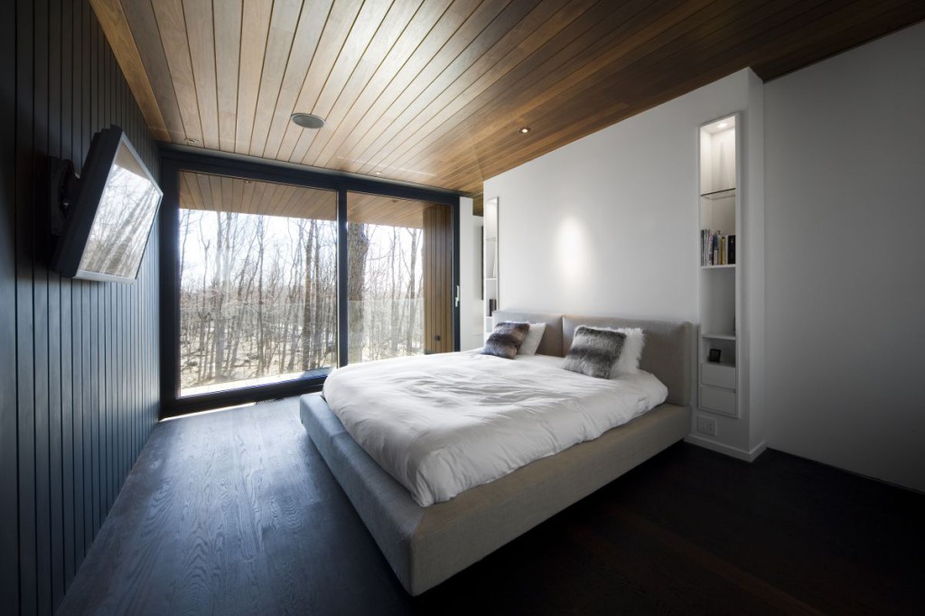 Les amateurs de solutions de design originales apprécieront également les chambres décorées dans un style japonais. Comme on le sait, dans de nombreux pays de l’Est, les principaux matériaux de finition sont le bois et la pierre. Pour la décoration du plafond de la pièce, de style japonais, vous pouvez utiliser de simples panneaux de bois de couleurs sombres. Vous pouvez expérimenter des éléments supplémentaires en décorant la surface avec des lattes.
