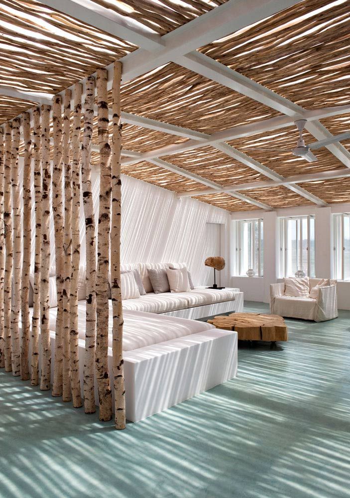 Dans le troisième exemple, un arbre sombre est utilisé comme finition. Le même type de décoration est utilisé pour décorer les murs. Tout cela a l'air très organique.