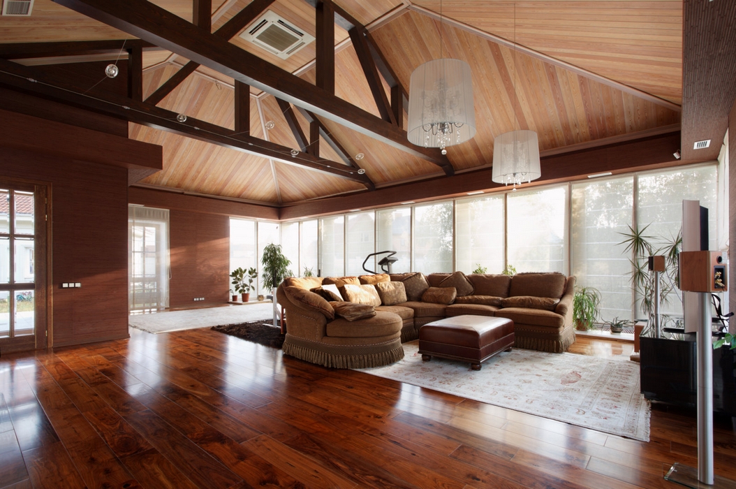 Le premier exemple est un salon lumineux décoré de bois naturel. Tout est naturel - et les murs et le sol et, bien sûr, le plafond. Cette combinaison de matériaux vous permet de créer une atmosphère agréable dans la pièce.propice au repos et à la détente en famille. Le plafond ayant une forme légèrement inhabituelle, sa base est complétée par des poutres suspendues. Et le bois sombre facilite la transition entre la salle à manger et le coin salon.