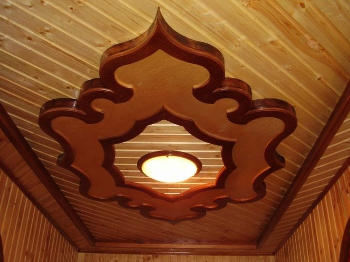 Ce type de décoration de plafond est inhabituel pour beaucoup. En fait, c'est une sorte de socle pour le plafond, en bois. Galteli vous permet de masquer certaines imperfections mineures à la surface du plafond. La longueur de chacune de ces parties est d'environ 120 mm. Il n'y a pas de joints qui gâchent l'apparence du plafond.