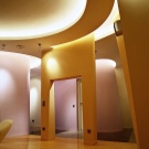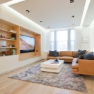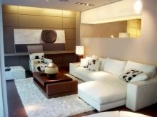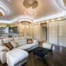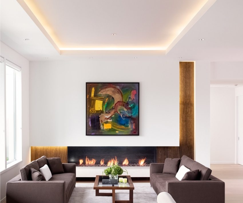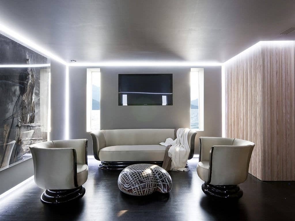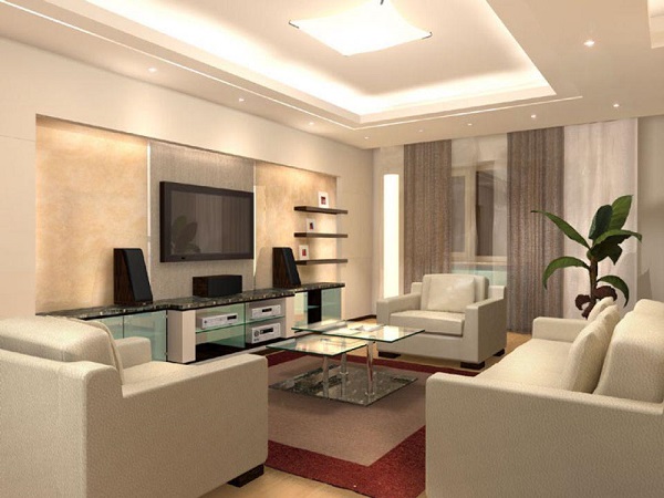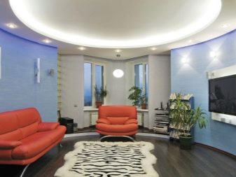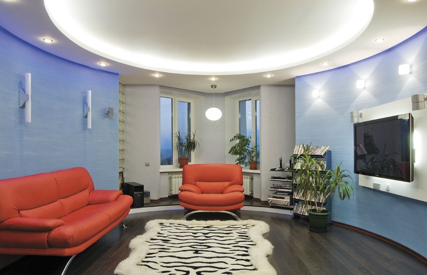 Si vous souhaitez visuellement rendre la pièce plus spacieuse et plus libre, vous devez vous tourner vers un plafond à deux niveaux avec une structure arrondie et l'encadrer d'une simple lumière blanche.
