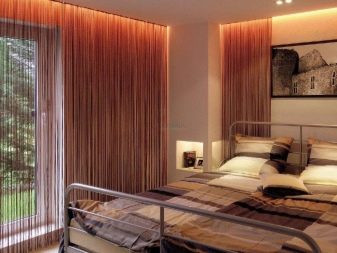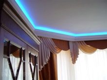 Il est intéressant de voir les ensembles dans lesquels la bande avec des diodes est fixée sur les rideaux des rideaux ou sur les éléments en saillie du décor. L'installation de ces dispositifs doit être effectuée de manière à diriger le flux de lumière sur le mur ou une certaine partie du plafond.