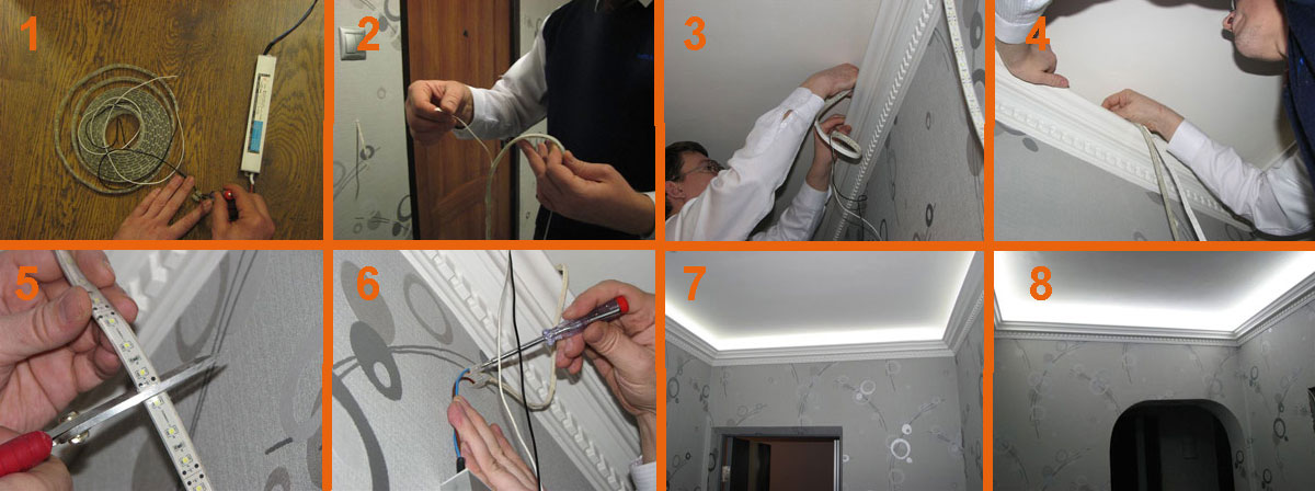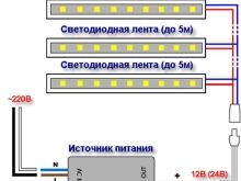 De nombreux utilisateurs sont intéressés par la création de la mise en page. Vous devrez connecter l’alimentation à l’amplificateur et à la seconde extrémité de la conception des LED. Sur le côté opposé, afin de réduire la charge, un segment supplémentaire de la bande lumineuse doit être fixé.