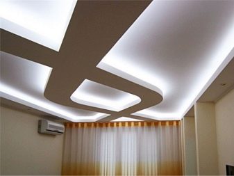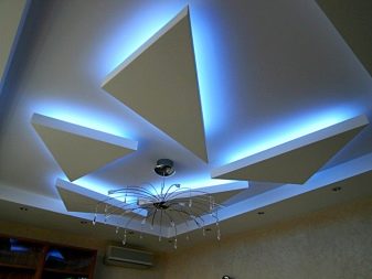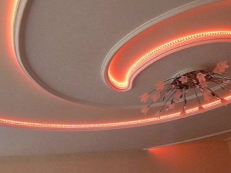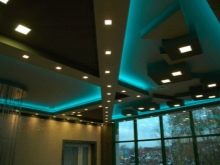 Aussi des rubans avec des LED peut décorer des structures suspenduesinstallé au plafond. Par exemple, il peut s'agir de détails de plaques de plâtre de formes géométriques régulières. Les bandes attachées sur leur base donneront des éléments supplémentaires à des éléments similaires.En vous référant à cette solution de design futuriste, vous pouvez installer au centre du plafond le lustre principal en métal brillant ou chromé.