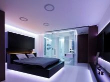 La bande de LED peut être installée dans n'importe quelle pièce. Par exemple, dans les conditions d'une chambre claire avec un mobilier sombre, une lumière bleue intégrée dans un plafond blanc à deux niveaux sera spectaculaire. La bande lumineuse est tout à fait possible de s’étirer au-dessous - sur le mur avec une image située au-dessus de la couchette. Une telle solution de design aura l’air très original et ultramoderne.