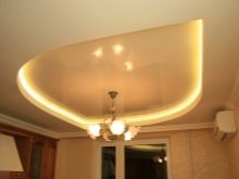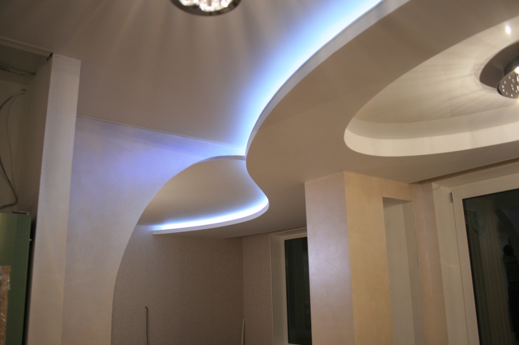 Par exemple, une bande flexible semblerait la meilleure dans un ensemble avec un plafond à deux niveaux, dont le premier niveau est constitué d'un film de tension. Les lignes de la boîte de plâtre (deuxième niveau) peuvent être gracieuses et ondulées. Dans un tel cas, des projecteurs intégrés dans la plaque de plâtre seront utiles.
