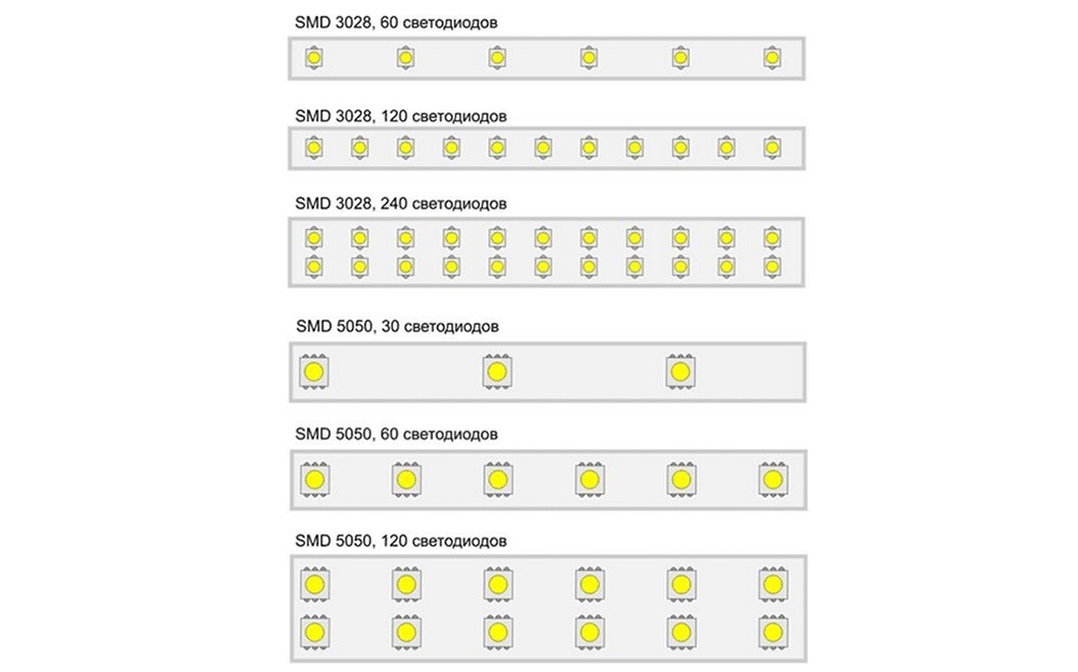 Il y a un nombre différent de LED sur différentes bandes de LED. De plus, ils peuvent avoir des tailles différentes. Pour obtenir une lumière plus brillante et plus saturée, une ou deux rangées de LED sont souvent soudées.