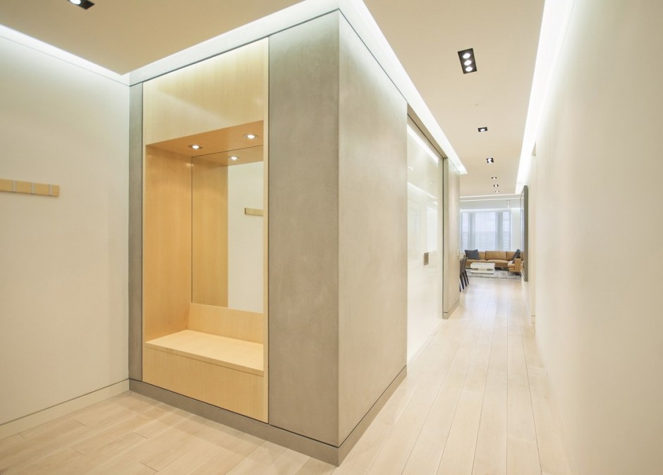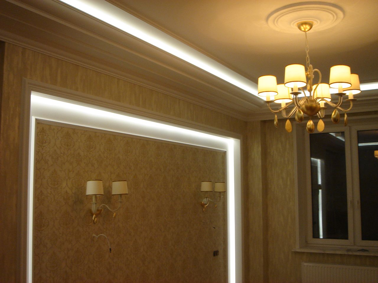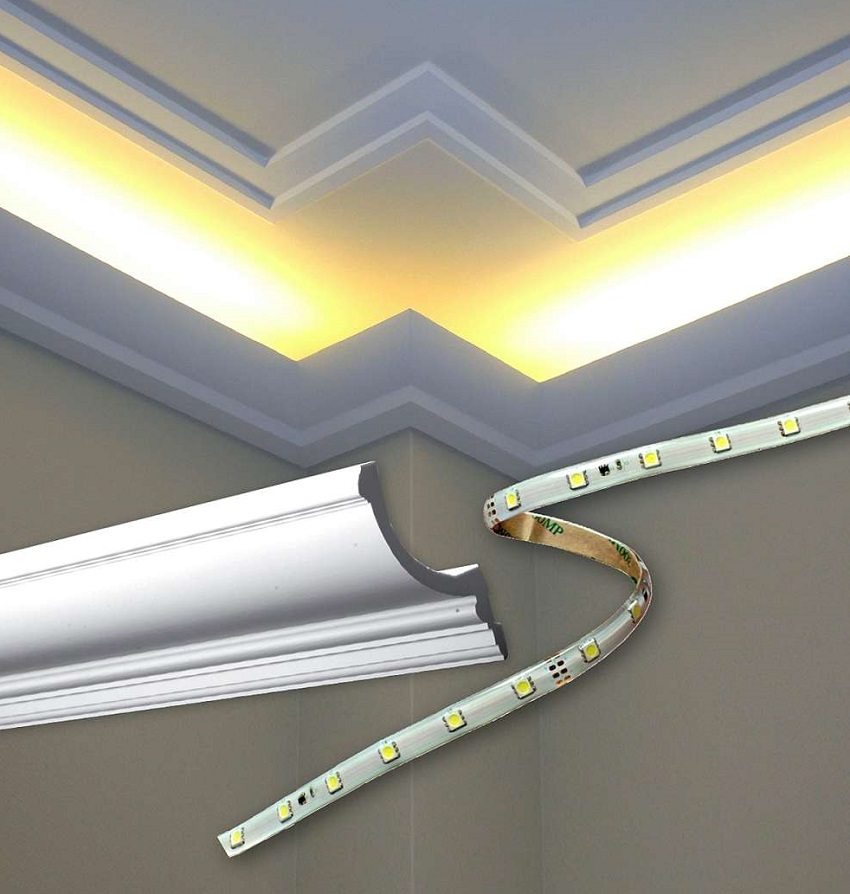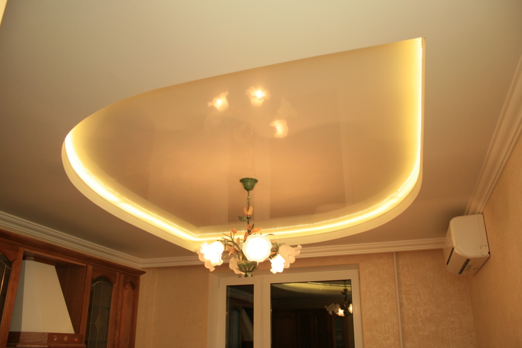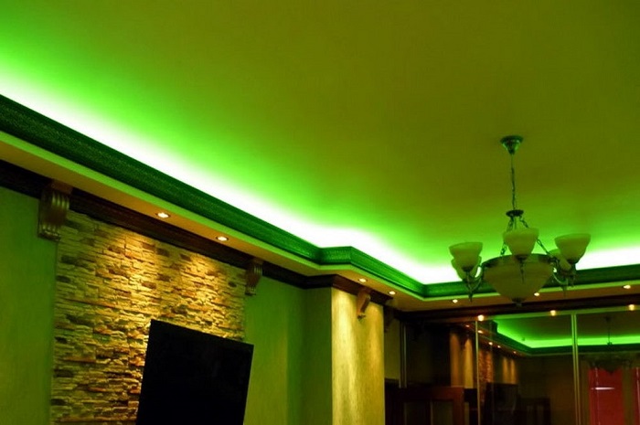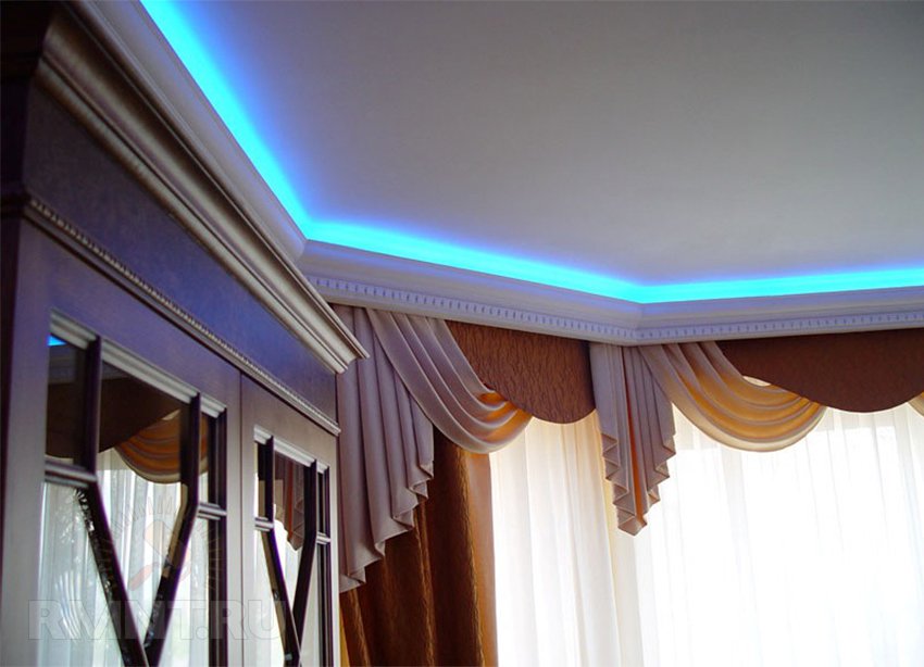 Le ruban de diode peut être caché sous le socle du plafond.Dans de tels cas, elle ne sera pas évidente et ne semblera pas intrusive. Sa lumière va doucement "regarder" de dessous la doublure, ce qui rend l'intérieur plus intéressant.