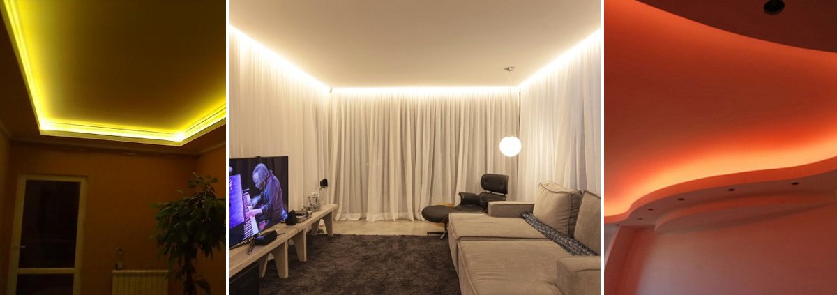 - De nombreux consommateurs choisissent exactement les bandes de LED pour la conception des plafonds, car leur prix est démocratique mais ne consomme pas beaucoup d’électricité.