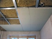 - Fixation des plaques de plâtre. Connaissant la largeur entre les murs, vous devez calculer le nombre de feuilles entières dont vous avez besoin et le nombre de pièces. Couper les feuilles avec un couteau de construction ou un fichier de plâtre. Fixez les tôles HL par incréments de 25 cm à l'aide de vis autotaraudeuses, les têtes des éléments de fixation étant noyées dans le panneau de gypse afin qu'elles ne rouillent pas avec le temps. Ensuite, ils fermeront le mastic. À la jonction de deux feuilles, collez un mélange de ruban adhésif spécial et de mastic de plâtre.Après séchage complet, les coutures doivent être poncées. Toute la surface doit être apprêtée pour que la finition soit mieux conservée.