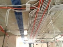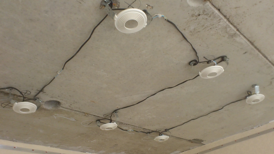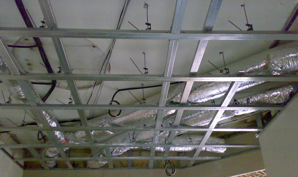 - Pose de communications. Avant de commencer à monter le cadre, vous devez effectuer tous les travaux associés au câblage électrique. Par exemple, si l’on sait que le dispositif d’éclairage sera volumineux, le lieu de fixation de celui-ci doit être renforcé avec des suspentes.