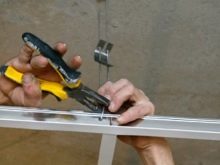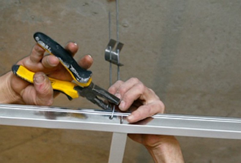 S'il est prévu de recouvrir les murs de la pièce de feuilles de gypse, un profil horizontal supplémentaire est inséré dans le revêtement mural en métal. Ceci est fait pour la rigidité de la structure. Sur ce profil supplémentaire est monté le coin du mur. Selon les lignes marquées, vous devez fixer un ensemble de supports (pendentif, papillon, aiguille à tricoter). Pour 1 m², un jeu de suspensions est requis. Dans les endroits où des lampes sont prévues, vous pouvez installer des fixations supplémentaires.