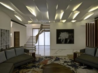 Le développement de plafonds de designers exclusifs de formes diverses et parfois fantaisistes peut coûter très cher au propriétaire. Mais elle sera la seule en son genre. Les matériaux modernes nous permettent de rendre presque invisible la structure cellulaire du plafond suspendu. Vous pouvez commander une conception différente des plaques, puis collecter au plafond une conception individuelle complexe.