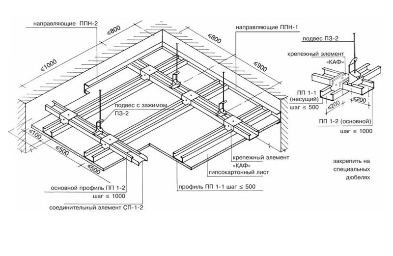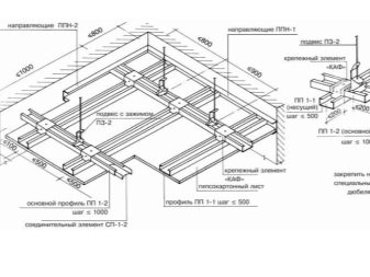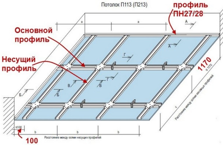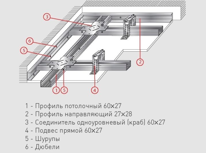 La caisse est faite de profilés en acier galvanisé.Elle n'a pas peur de l'humidité car le profil est protégé par du zinc. Des bandes de plafond (60x27 mm) et des guides (27x28 mm), ainsi que des suspensions, qui retiendront la structure: papillons, attelages, suspensions d'ancrage, éléments de connexion, seront nécessaires pour installer le plafond en placoplâtre ou en plastique. Pour la fixation, vous devez acheter des vis à métaux et des goujons en polypropylène.
