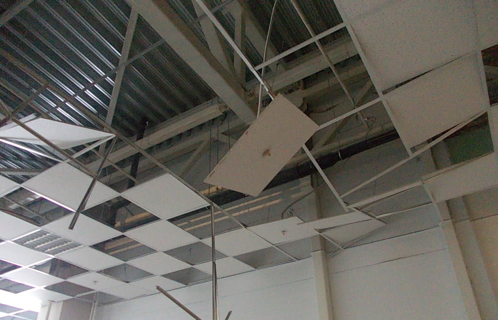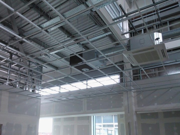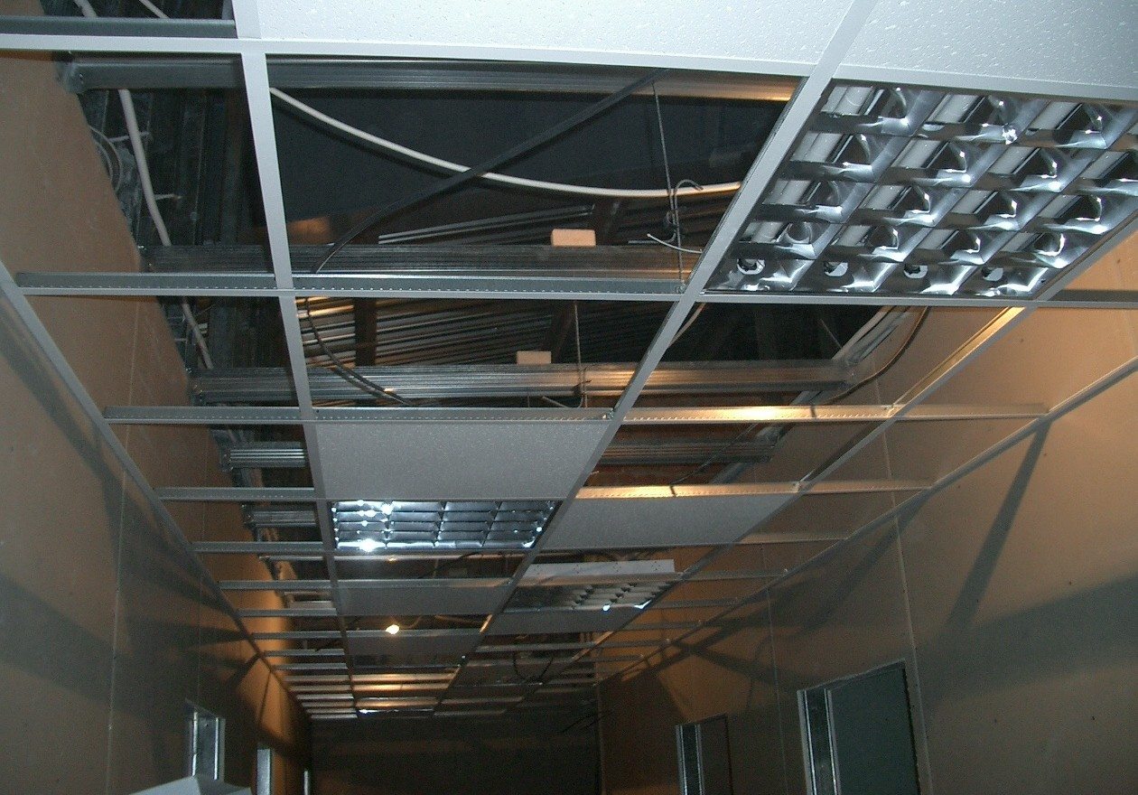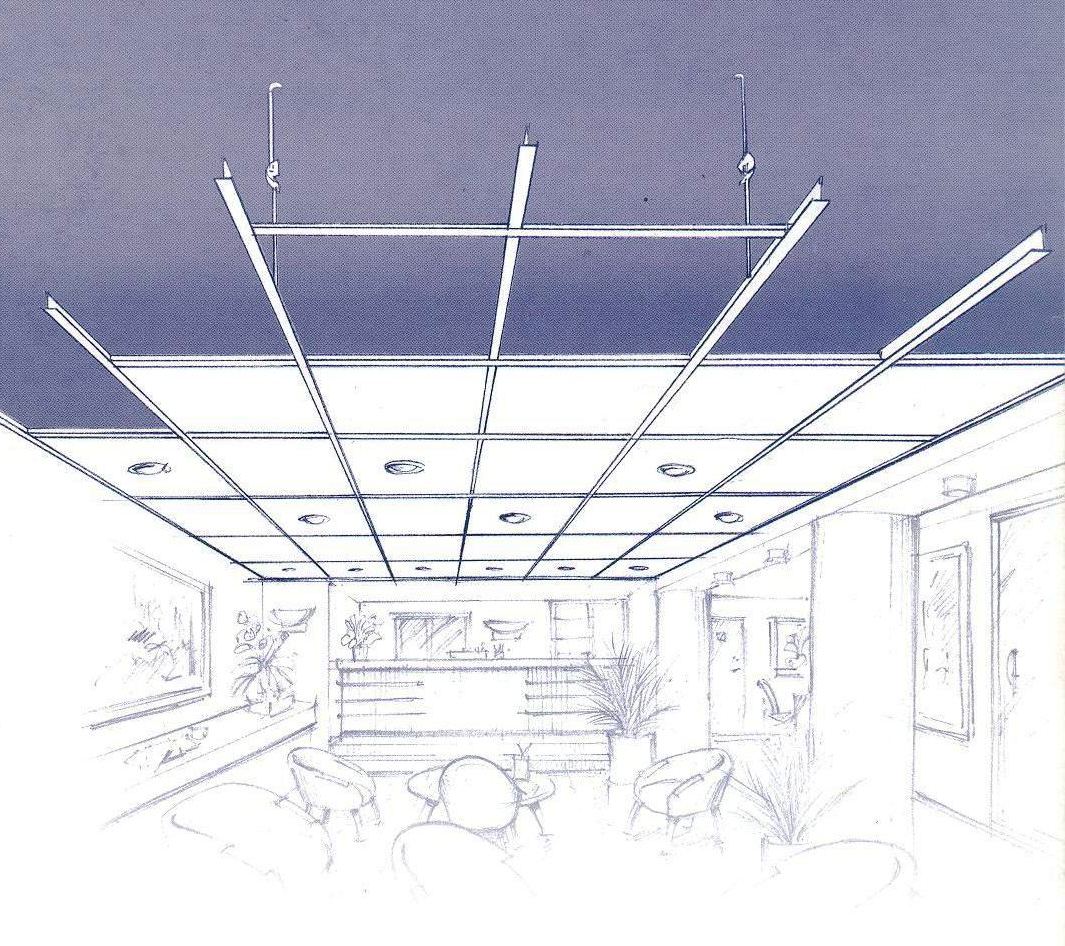 Le plafond suspendu se compose d'un cadre en métal qui occupe toute la surface de la base et de dalles de plafond fixées aux structures de support.