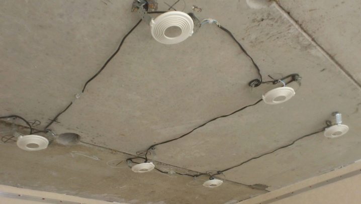 - Pose des communications et choix du lieu pour la lampe. Pour installer un projecteur, vous devez utiliser une couronne pour faire un trou dans la cloison sèche. Non autorisé dans le profil. Dans le cas d'un lustre, il est fixé à la base ou au profilé de guidage. Le profil doit en outre être renforcé avec des suspensions. Les fils sont empilés dans un tuyau ondulé spécial. Les communications du luminaire suspendu sortent par un trou dans la cloison sèche.