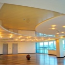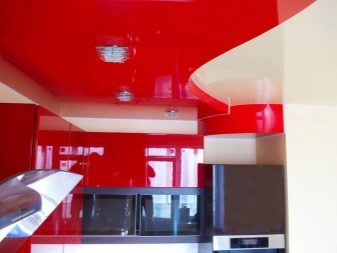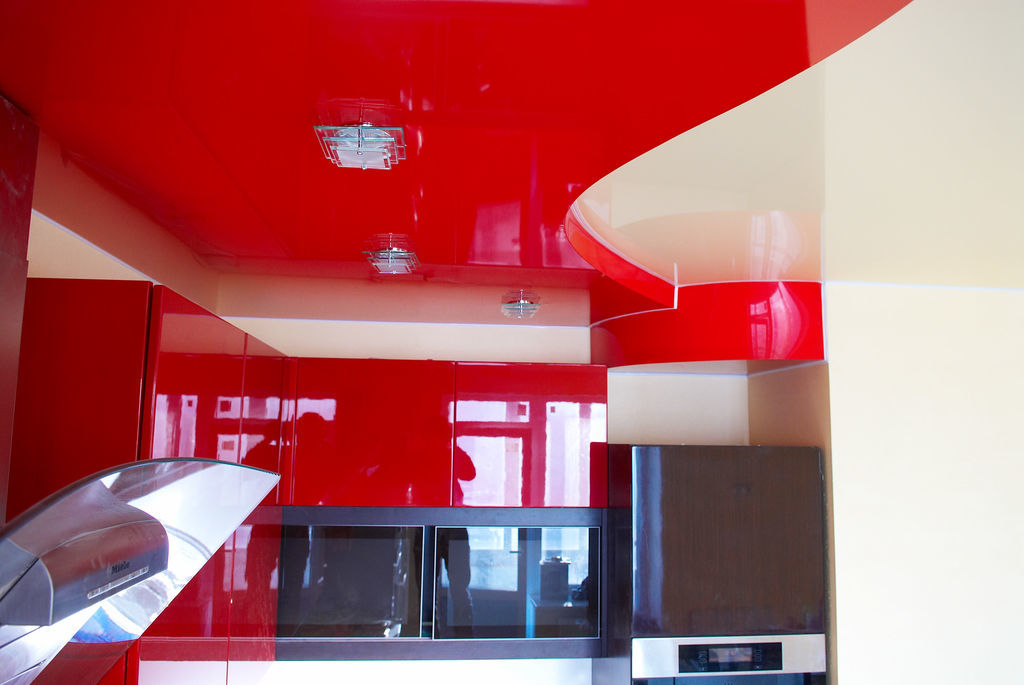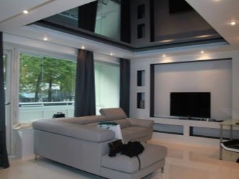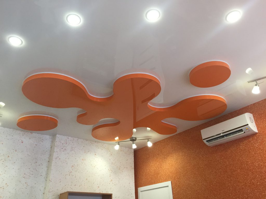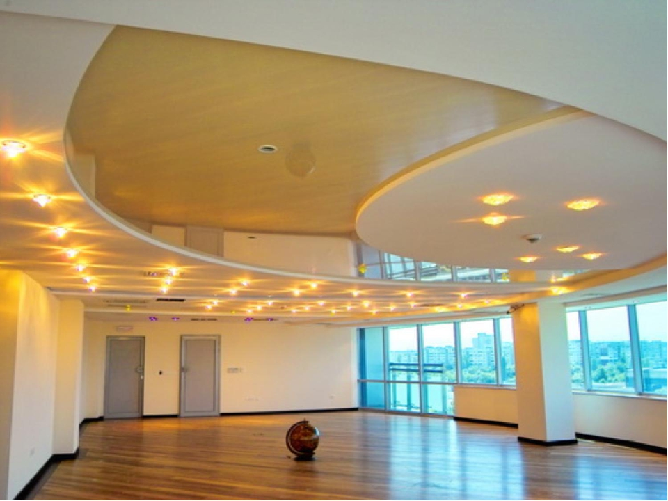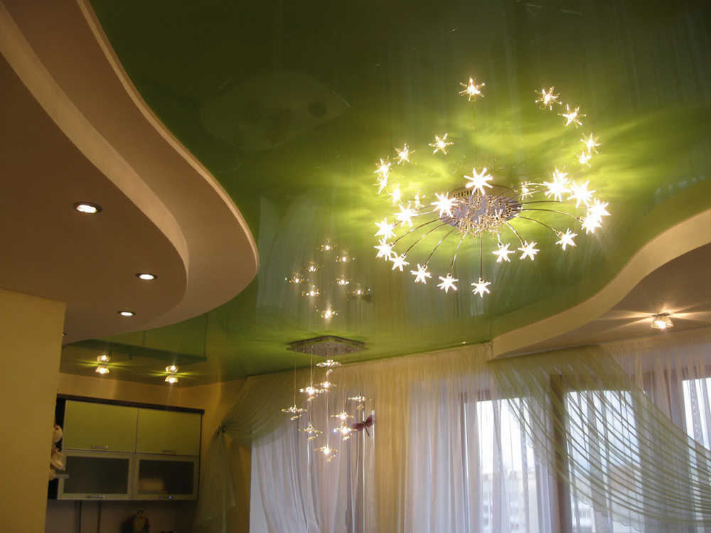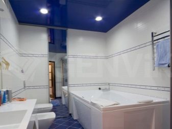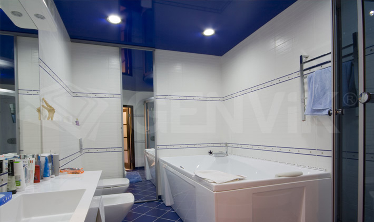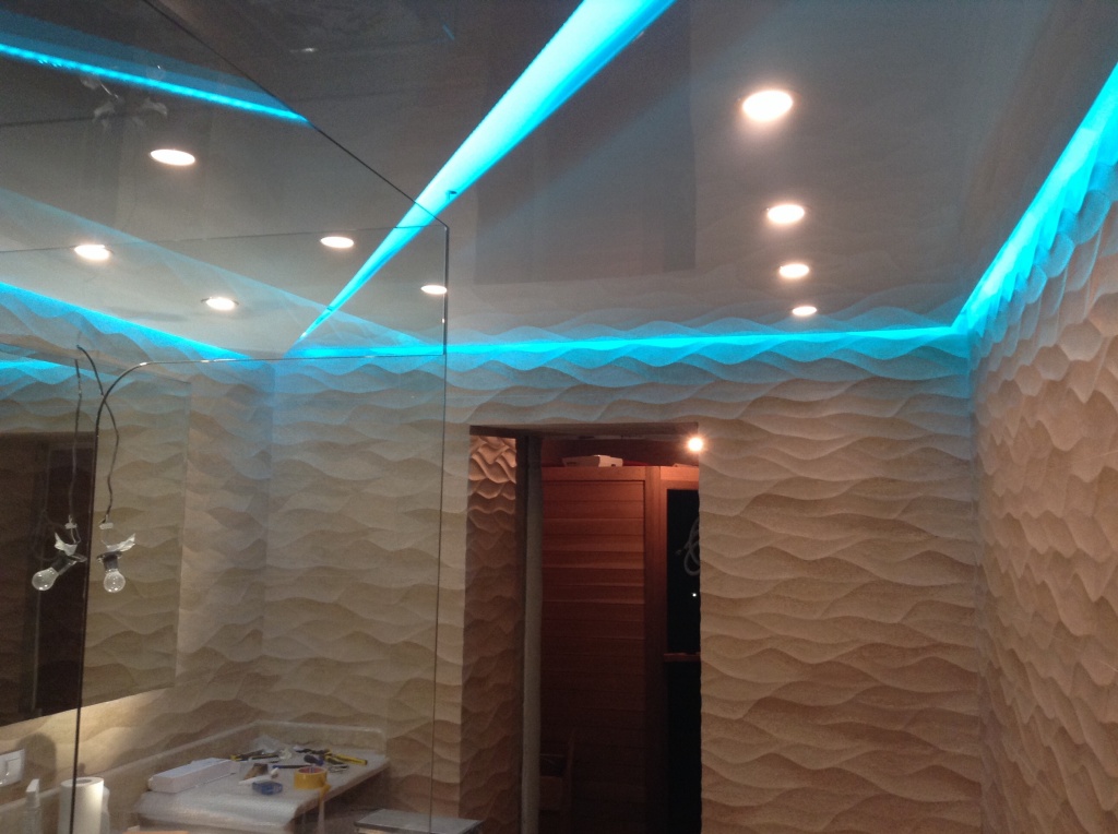 Dans ces endroits, il n’ya souvent pas de fenêtres et il est donc important de compléter la structure suspendue par une masse de petites lampes et de matériel blanc. Des structures de suspension complexes de deux ou plusieurs niveaux ne sont pas souhaitables. Ils ne sont autorisés que dans le cas d'un plan ouvert.Le plus souvent, la conception est réalisée à l'aide d'un film de tension.