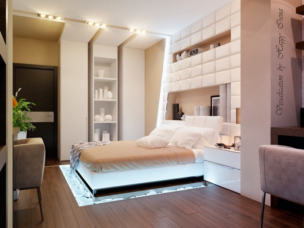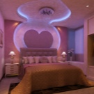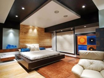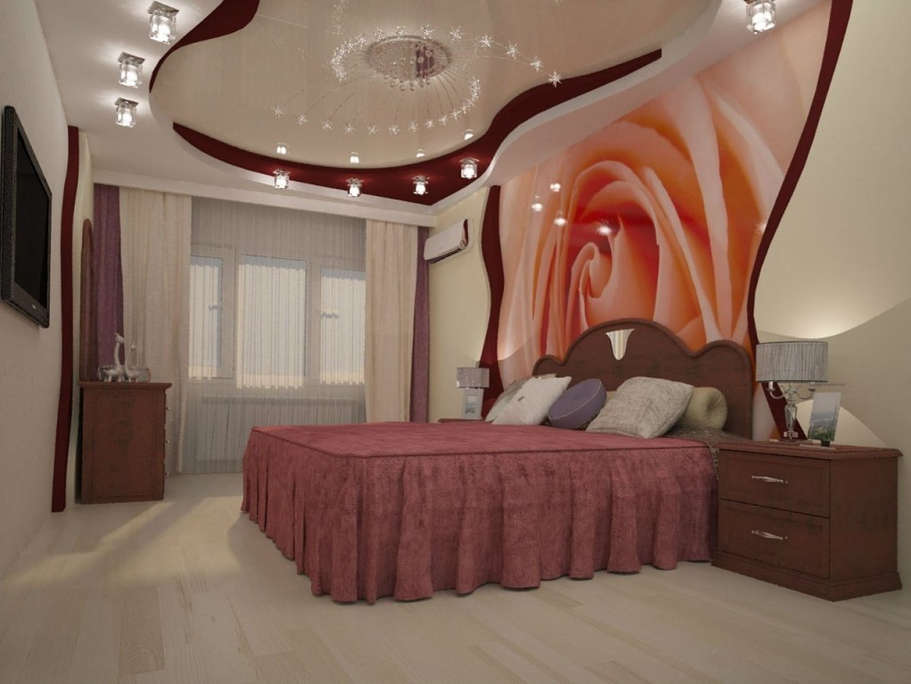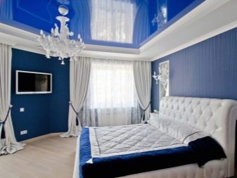 Ici, nous avons besoin de couleurs douces et de texture mate ou satinée. Le gloss est indésirable: il crée un stress émotionnel. Plus de deux ou trois niveaux pour la chambre à coucher ne doivent pas être construits: visuellement, l’intérieur sera lourd.Pour adoucir les tons, vous pouvez ajouter une couleur blanche au motif. Ajout harmonieux de rétro-éclairage dans un décor plaqué or ou argent.