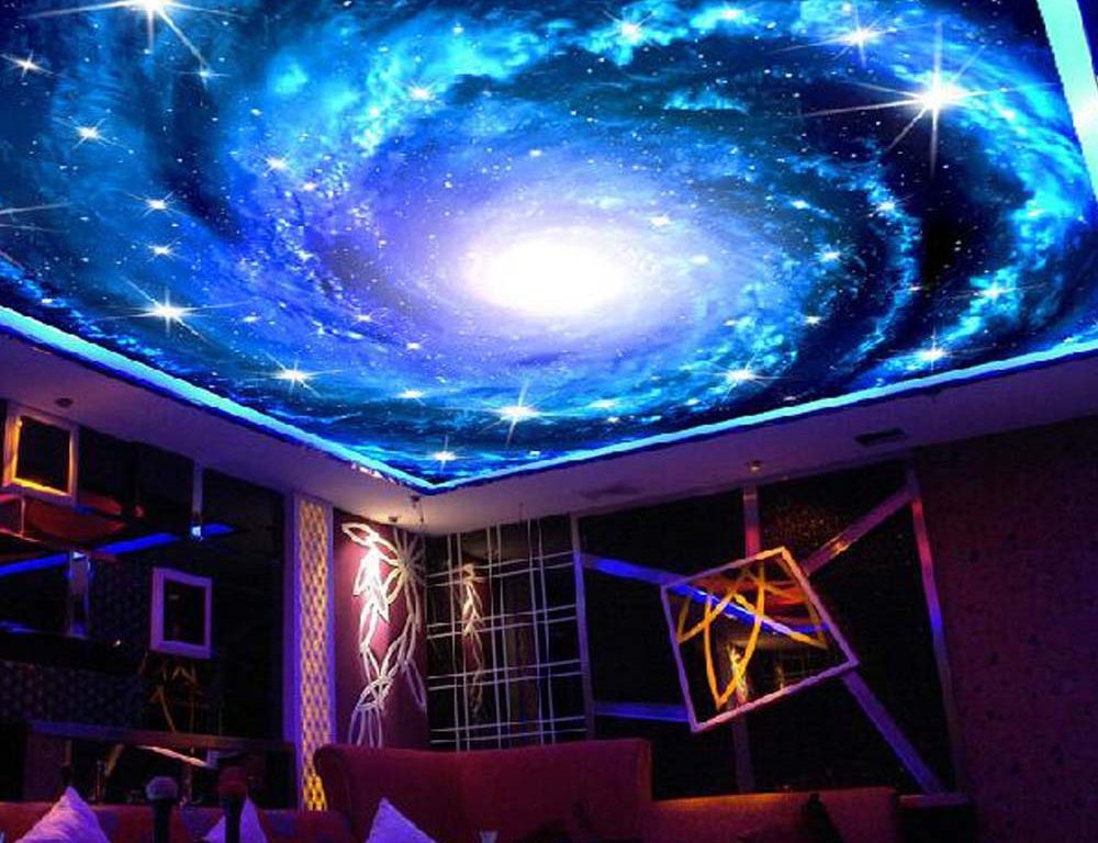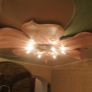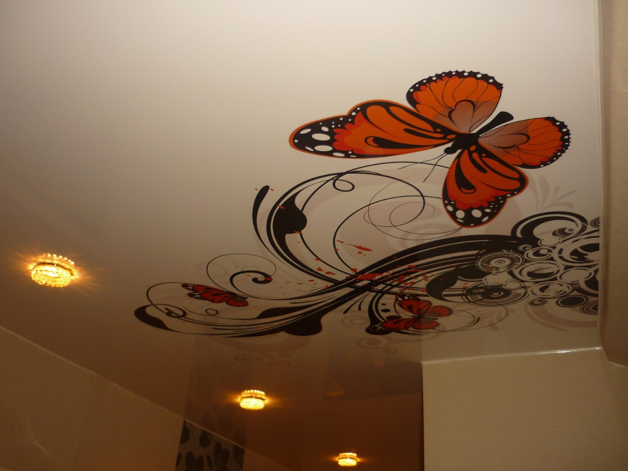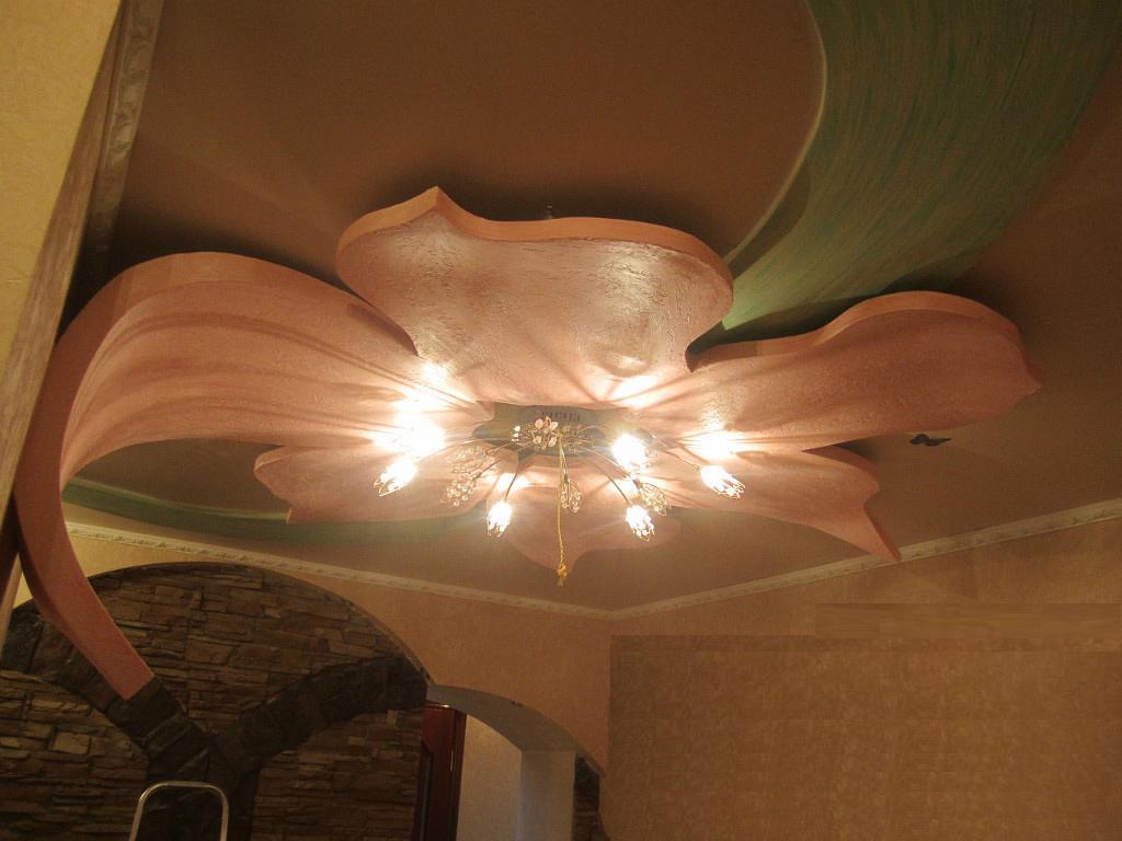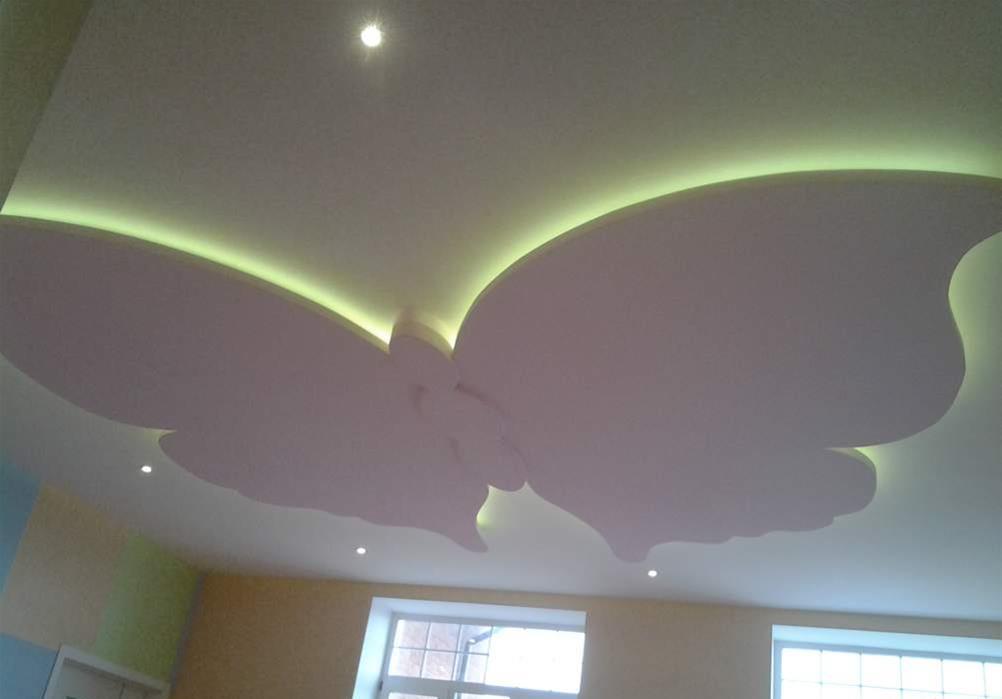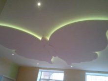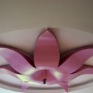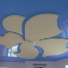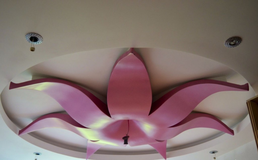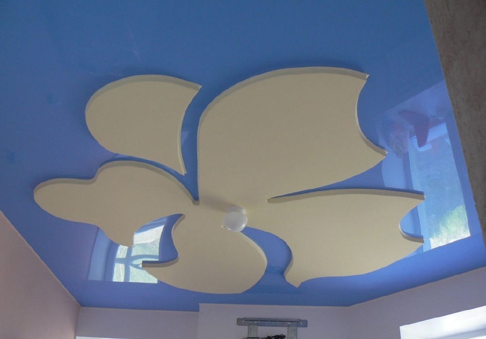Les paramètres des formes utilisées dans la conception sont sélectionnés de manière à ne pas être perdus sur le fond général du plafond et forment une composition harmonieuse. Pour ce faire, dessinez une esquisse, après quoi les pièces fonctionnent en taille réelle. Il peut s'agir de figures de grandes fleurs, de papillons, d'étoiles, de détails abstraits. Pour les enfants interprètent les éléments sous la forme du soleil avec des rayons. La taille de ces éléments varie de 1,5 à 2 m et plus.