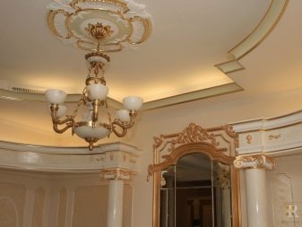 Afin que sa lumière ne chevauche pas l'avant-toit, il faut laisser un espace d'environ 10 cm entre elle et le mur. Outre l'éclairage, ces plafonds sont décorés de moulures en imitation de plâtre. Ce décor est magnifique.Par exemple, si vous décorez la zone autour du lustre, vous pouvez ajouter de l'élégance au design le plus ennuyeux. La particularité de ce décor réside dans la possibilité de peindre avec une éponge et une peinture conventionnelles (par exemple, avec une dorure).