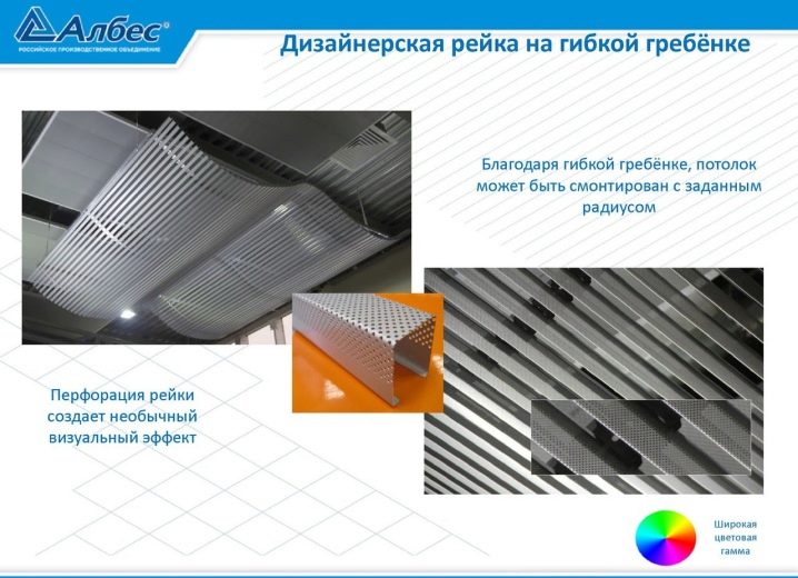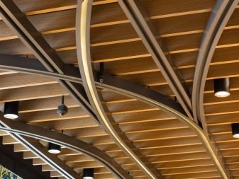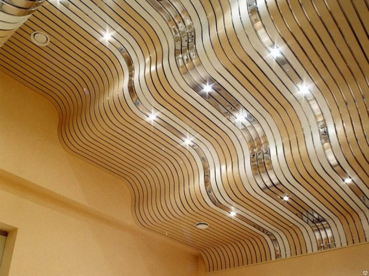 Les lattes utilisées dans ces structures sont résistantes aux changements de température. Le plus souvent pour la conception de ces systèmes utilisant des lattes en acier. Ils sont plus durables et fiables et ont un niveau élevé d’isolation phonique. L'avantage principal des plafonds à lattes est la possibilité d'aligner même les sols les plus courbes.