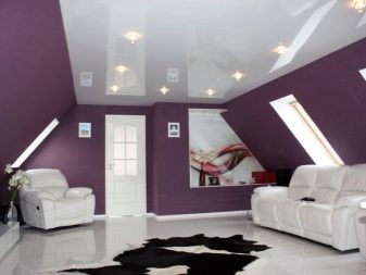 Ici, les structures suspendues ne sont possibles que si la toiture le permet. Vous pouvez donc créer des accents sous la forme de rails, d’un petit treillis et d’une cloison sèche. Plastique indésirable. Il simplifie visuellement l'apparence du plafond et ne se combine pas avec les murs en bois formés par le toit.