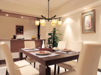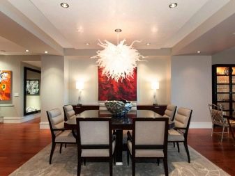- Essayez de choisir le design de sorte qu'il soit combiné avec des dispositifs d'éclairage.Le lustre n'a pas toujours fière allure par rapport à un motif asymétrique.