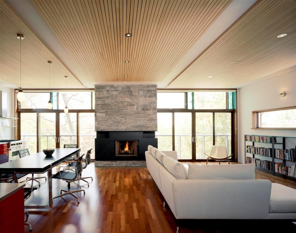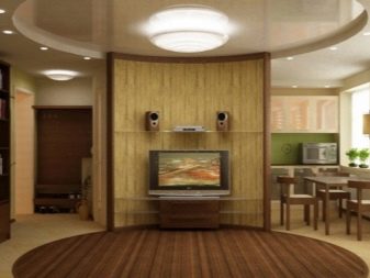 Il semble bonne combinaison de cloison sèche avec des panneaux de plafond ou des lattes. Les structures à un seul niveau ne conviennent pas ici: les plafonds en relief avec de grandes fenêtres, lampes ou panneaux, éclairant différents coins de la pièce sont préférables.