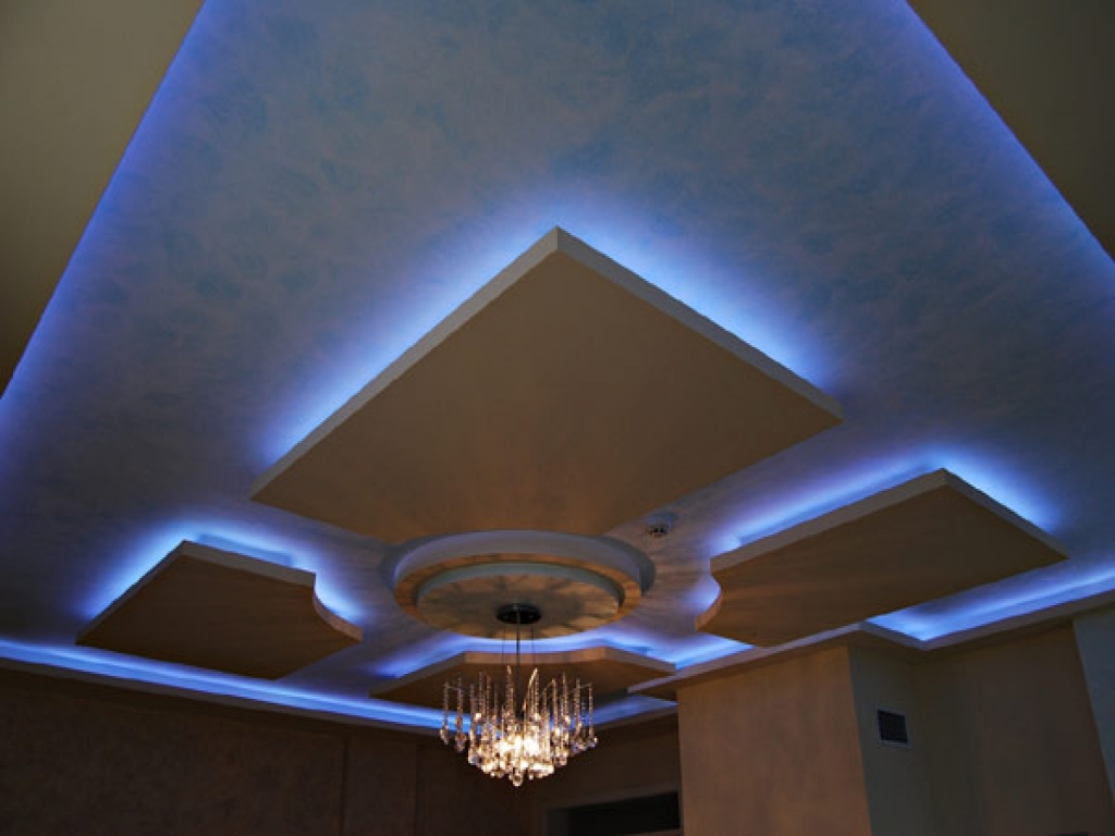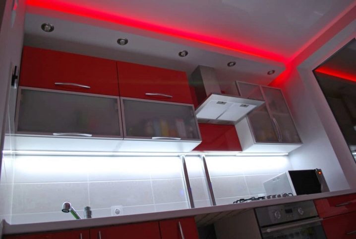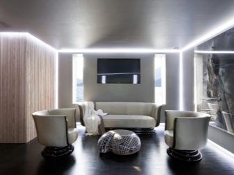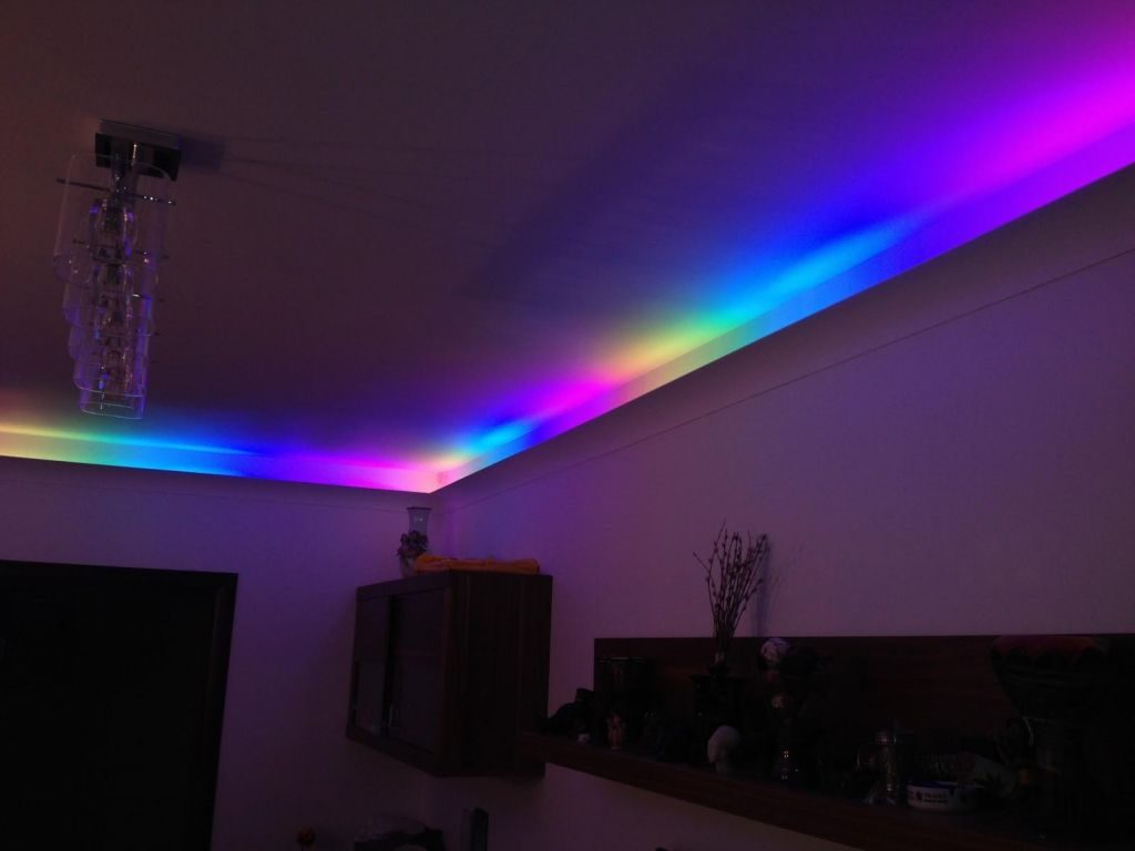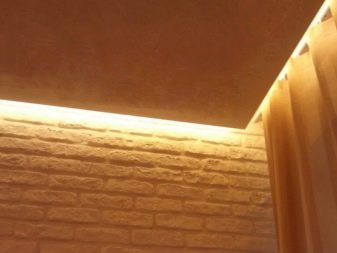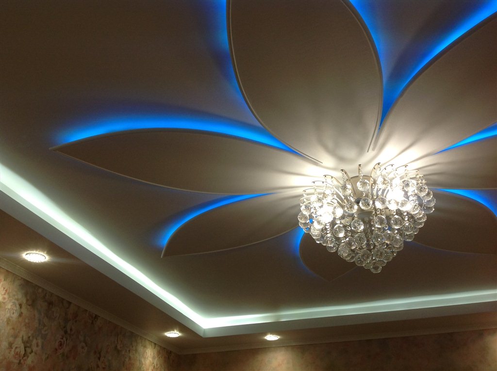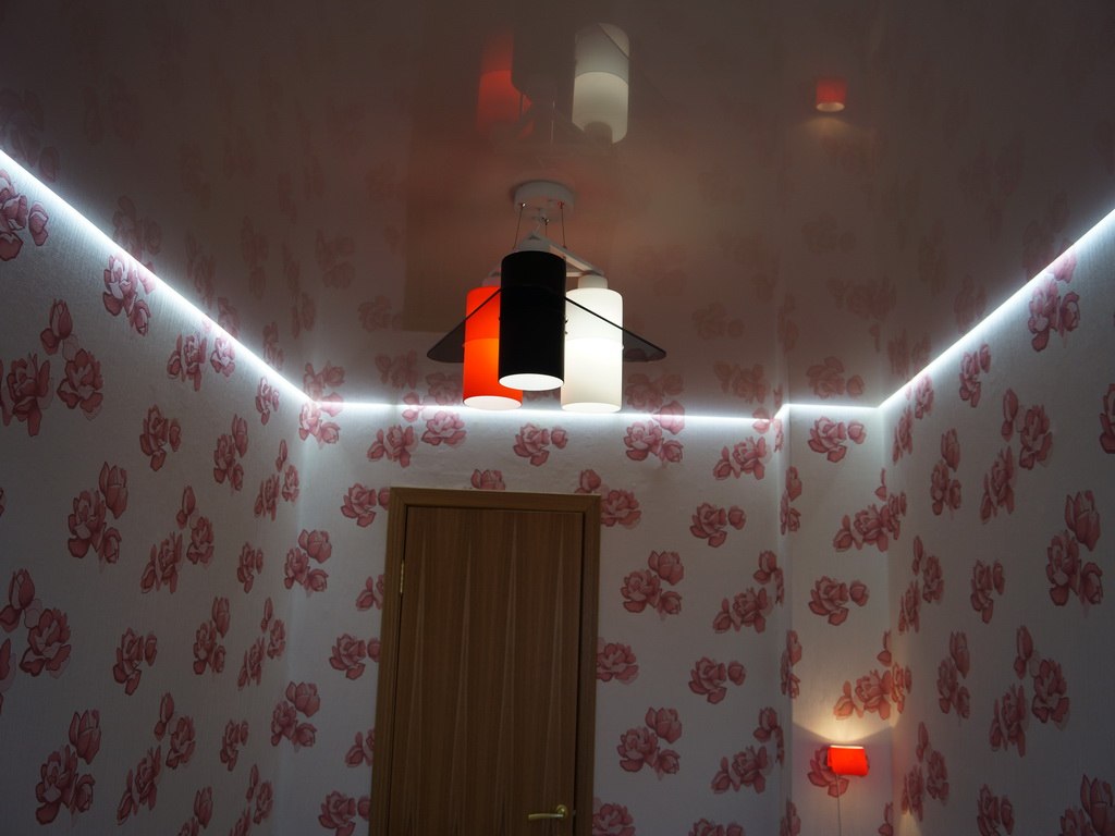 Le cordon et le ruban sont remarquables en ce qu'ils peuvent être intégrés aux structures suspendues avant et après leur installation de base. Par exemple, si un éclairage intérieur est prévu, l’intégration de la bande de LED est pensée dès la phase de conception. Cela rendra le plafond volumétrique et réaliste. Si l'installation a déjà été effectuée, mais que vous voulez de l'élégance, vous pouvez cacher la bande derrière la gouttière ou la baguette. Cela créera l'illusion d'un plafond "en flèche".
